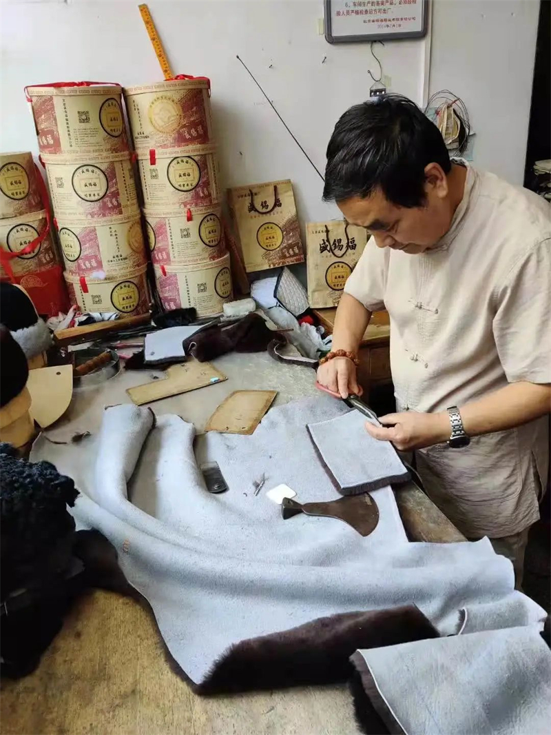 李金善老師於1974年進入盛錫福工作,19歲的他正式與皮毛結下了不解之緣。從配活兒要求的長短粗細密度倒向要一致,到裁製皮毛時人字刀、月牙刀、梯子刀、弧形刀、魚鱗刀等種種刀法的靈活應用,還有縫製時要頂子圓、吃頭均、縫頭勻,蒙皮面時要縫對縫、十字平,勾扇、翻帽、串口等,這一道道工序,一個個步驟,是幾十年的堅守如一,才能創作出這麼多精美的作品。