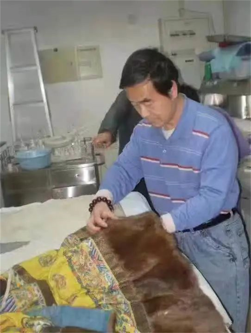 在李老師的從業經歷中,有這麼一段特殊的經歷,那就是為故宮博物院修復一件清代的皇袍。清代皇帝的服飾分為夏朝冠和冬朝冠,皇袍的圍邊、領角、馬蹄袖等皮質部分是裘皮類的,用的材料叫「海龍」,是當今世界上能找到的最好的皮類。這件需要修復的冬朝冠是當年嘉慶皇帝穿過的,當時毛已經掉得只剩皮面的那一層了,要修復起來十分的困難。為達到修舊如舊,從配皮選料開始,李老師就一件件過手,精挑細選,尋找「海龍皮」已十分不易,更何況還要找到和當年同樣的顏色,絨厚度、毛針等等細節一樣的海龍皮,這中間花費的時間的和心力無法只用簡單的文字可以描述出來。功夫不負有心人,也因為李老師的高超技藝,這件龍袍修復工作在歷時8個月的細心修補下,圓滿完成,這件龍袍也由修復前的國家二級文物,在修復後成為國家一級文物。