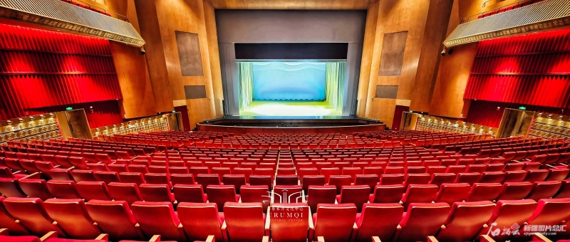 走進大劇院,可以看到觀眾區以中國紅為主色調,地面選用深棕色柚木,牆面選用金色,天花板表面是提取揚琴琴弦的設計元素,簡潔大方又能提供早期的反射聲。牆面點綴中國傳統回形紋樣,既豐富了視覺效果,又兼具聲學擴散體的功能,是建築、文化、藝術、聲學技術與裝飾面的巧妙結合。