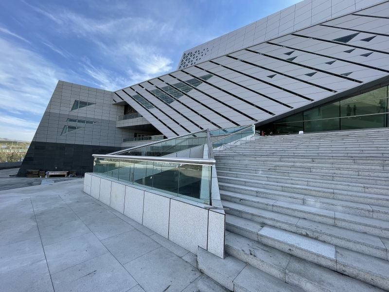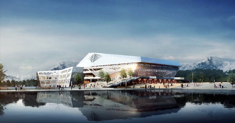 文創中心按照功能不同分為演藝劇場、多功能廳、報告廳、排練廳、活動室等。其中,演藝劇場是按照國家大型劇場標準設計,共設置有1500座位,分為兩層,一層為1100座,二層為400座。劇場舞台是鏡框式舞台,由一個主台和兩個側台組成,建築台口寬24米、高11米,配備有先進的聲、光、電等舞台設備,將山和雪的自然元素融入室內,以表現自然生態的設計理念。同時,配套有管弦樂排練廳、合唱排練廳、琴房、同聲傳譯、化妝間、服裝間、演員休息室、貴賓接待室等輔助用房。
