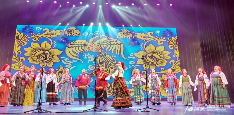 清晨,美麗的朝霞照射在伏爾加河畔,優美的旋律響起……歌舞《黎明的曙光》拉開了演出的序幕。接下來,《歡樂的小鳥》《鄉村舞》《花園漫步的女孩》等20多個內容豐富、形式多樣的節目接連上演。經典的旋律、艷麗的俄羅斯民族服飾……演員們用歡快的舞姿和優美的歌聲盡展俄羅斯民族風情,「蹲地跳旋」等俄羅斯舞蹈中的經典動作頃刻間點燃了現場觀眾的激情。