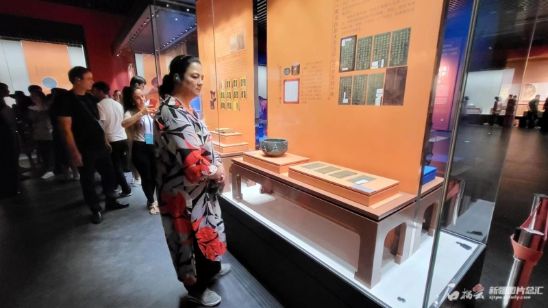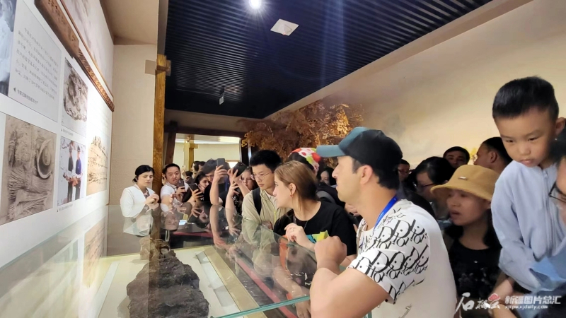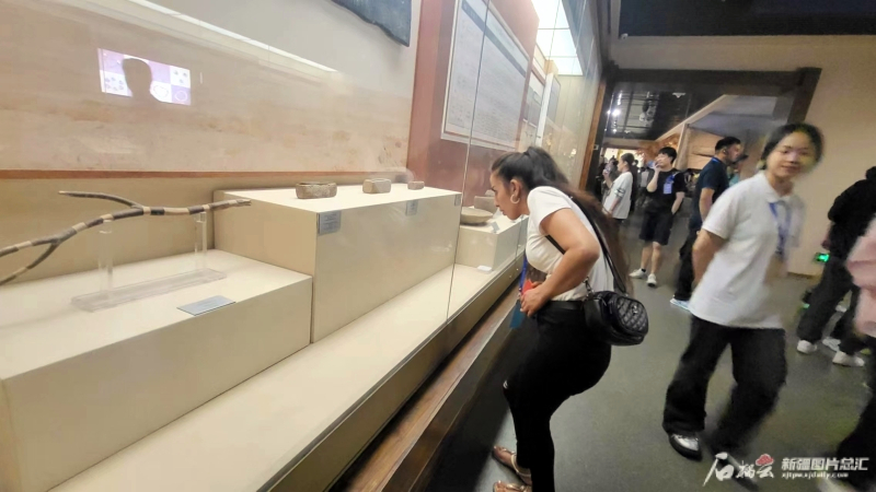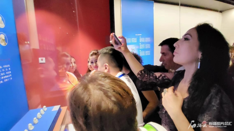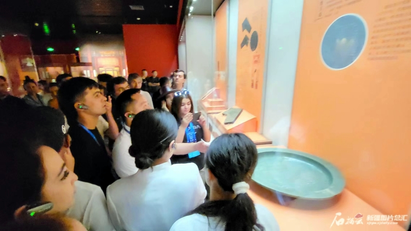 塔吉克斯坦羅拉國家功勛歌舞團演員們在參觀自治區博物館。石榴雲/新疆日報記者阿比拜攝
