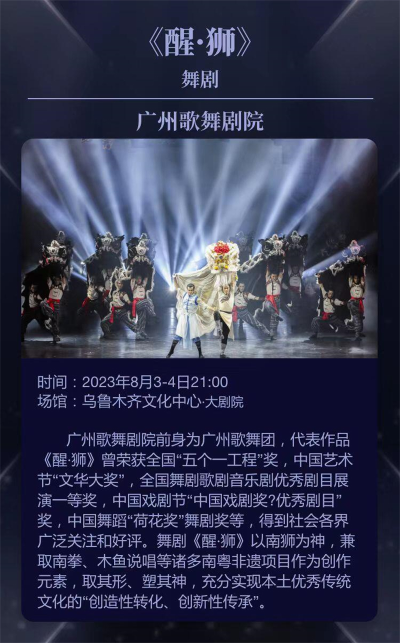 由於中國傳統的舞獅表演是最早將武術與舞蹈完美地結合在一起產生的一種獨特的表演,這種表演只有中華兒女才能演繹出它的靈魂。今天,武術與現代舞蹈再一次通過巧妙的方式發生了碰撞,產生了另一種與舞獅完全不同的風味。這一次,我們仍然能看見最傳統的舞獅表演。廣州歌舞劇院帶來的舞劇《醒·獅》將呈現與來自香港的舞團帶來的《凝》截然不同的「武舞相諧」的場景。