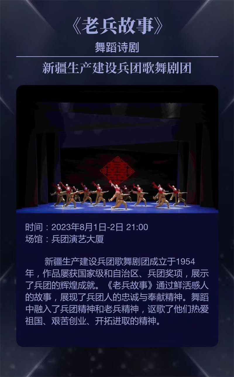 當然,新疆奉獻的演出會為本屆舞蹈節「豹尾收官」,《崑崙之約》《五星出東方》兩台舞劇已經擁有了極高的知名度,尤其是《五星出東方》剛剛完成她的全國巡演,勢頭正盛。此外,有着感人至深的故事背景的《老兵故事》,將會為我們講述一段兵團老兵的「隱密的傳奇」,這三台節目將會成為「新疆的榮耀」,會給更多人在記憶深處印下深深的印記。