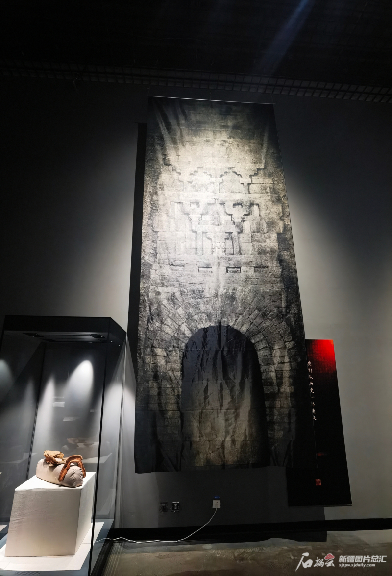 本次特展展廳的一角,懸掛着一幅巨大的展板,它是庫車市友誼路墓群中一座墓室門的全景。2007年,友誼路晉十六國墓群被發現,入選當年的「全國十大考古新發現」,它對準確闡明漢晉時期中央政權對西域的有效管理,具有重要價值。