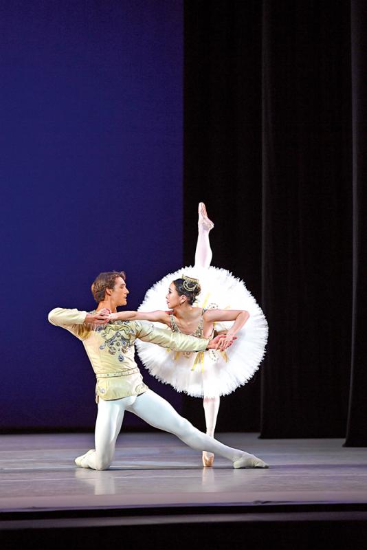 《珠寶》的第三幕「鑽石」,丹尼爾.卡馬哥(Daniel Camargo,左)與葉飛飛合演「慢板」雙人舞。香港芭蕾舞團提供