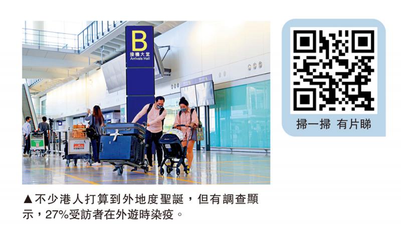 聖誕、元日長假期將至,不少港人打算出外旅遊,病人醫護權益協進會昨日公布調查結果顯示,75%受訪者或其親友曾於疫下離港外遊,當中27%受訪者在外遊時染疫;而打算於未來半年內外遊的受訪者中,近七成人打算到當地後不戴口罩。專家表示,不應忽視染疫或二次感染風險,提醒家長及子女應在外遊前14天接種新冠二價疫苗。