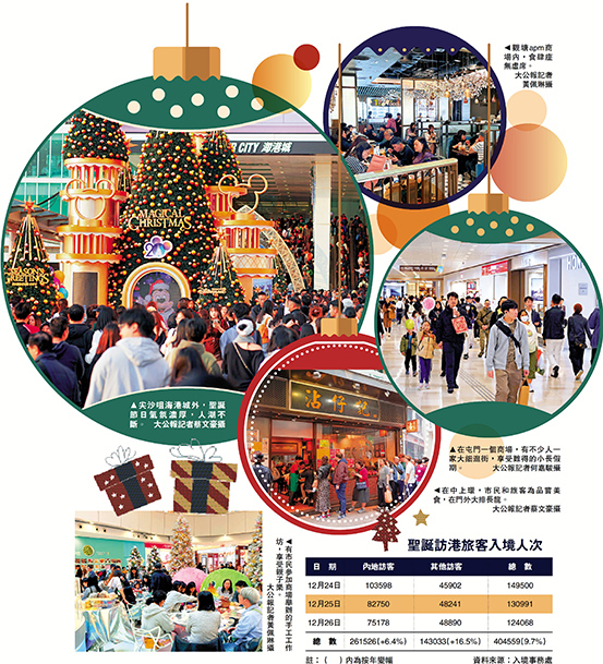 入境處數據顯示,昨日截至晚上9時,共有超過102.5萬人次經各口岸出入境,包括47萬多人次出境、55萬多人次入境。當中內地訪客入境人次逾14萬,海外訪客近4.6萬人次。由12月24日至26日,訪港旅客達40萬人次,按年增長9.7%;其中內地旅客佔26萬人次,按年增6.4%,海外訪客錄雙位數增幅,達16.5%。