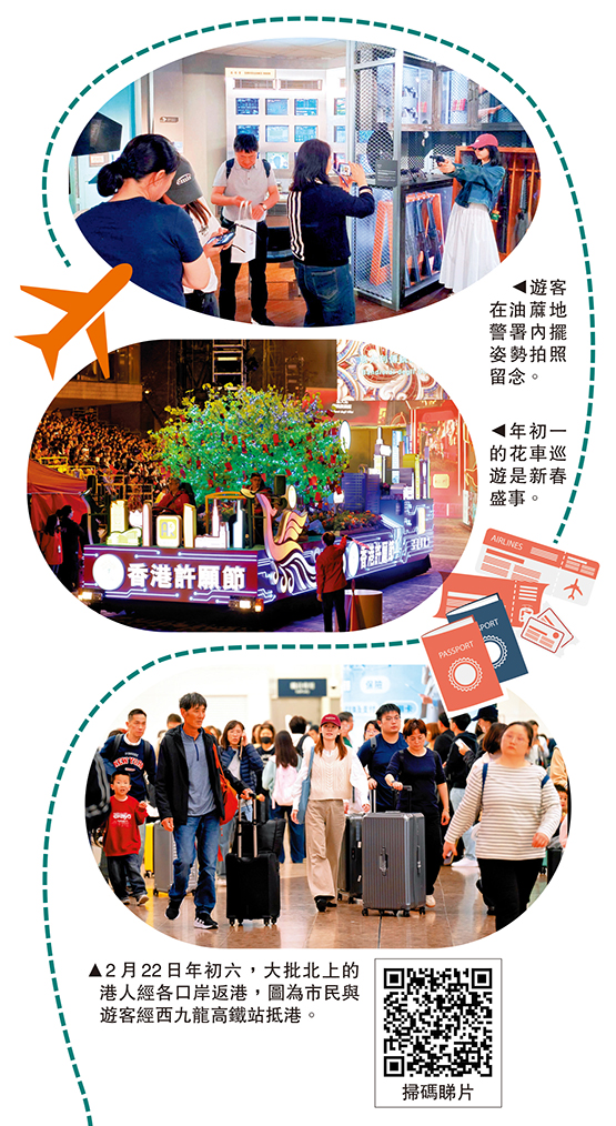 春節假期昨日結束,截至昨晚9時,入境處於各口岸共錄得102.2萬出入境人次,當中入境超過63.4萬人次;內地春節長假亦在23日完結,年廿九至初五,六日共約102萬內地客入境香港,按年升13%。